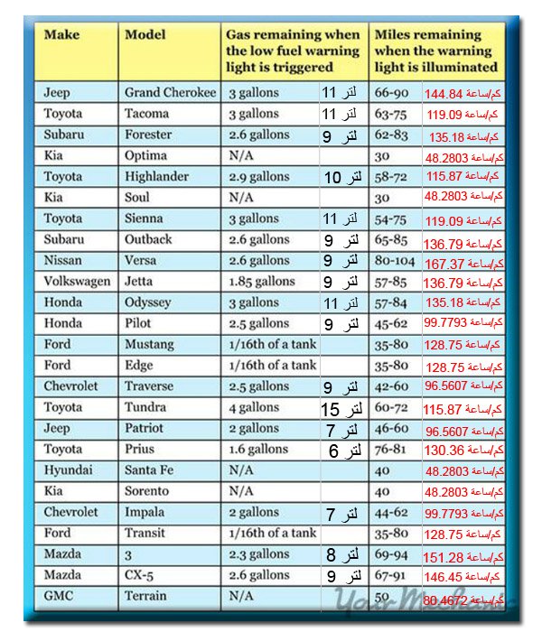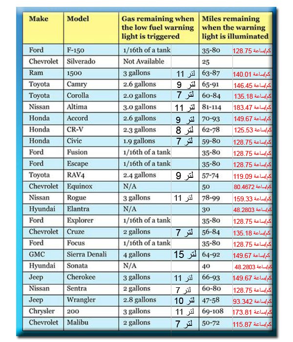 الأرقام المبينة بالجدول هي أرقام استرشاديه وتختلف من سيارة إلى اخرى بحسب سعة محرك السيارة.